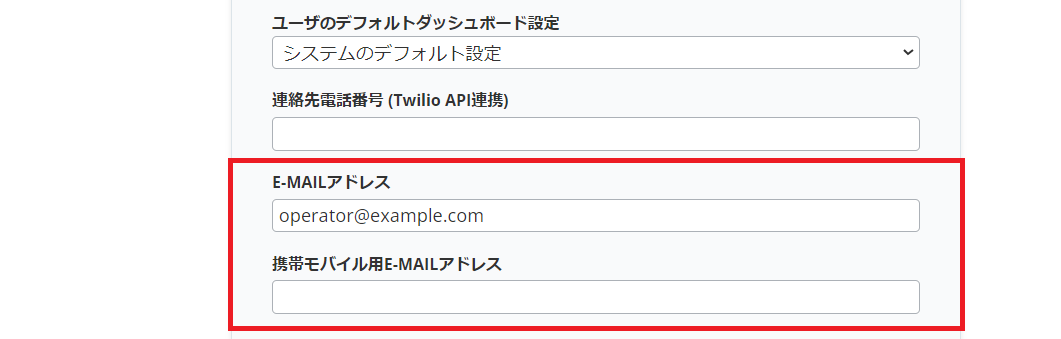 ユーザ ID などの必須項目を入力し、メール通知を行うために必要な「E-MAILアドレス」、または「携帯モバイル用E-MAILアドレス」項目を入力します。